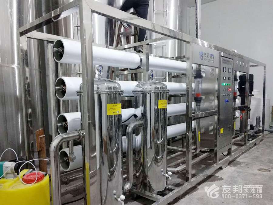 炭過濾器→軟化水器→中間水箱→低壓泵→PH值調(diào)節(jié)系統(tǒng)→高效混合器→精密過濾器→高效反滲透→中間水